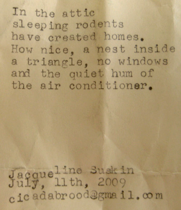 While wandering the wooded alleys of the Oregon Country Fair on the afternoon of July 11 2009, I came across a young lady with a typewriter. Her typewriter had, printed upon it, "POEM STORE your subject & price". I approached her and said, I'd like three dollars worth of squirrel in the attic". She said okay, sat down with a grim expression, and began to type. Ninety seconds later, she pulled this parchment from the typewriter and handed it to me, and I gave her three dollars and I put the poem in my pocket and walked away. I later found it in my pocket and posted it below, here on my squirrel-in-the-attic website: